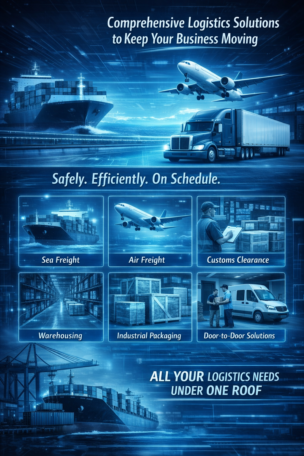 Our range of services includes Sea Freight, Air Freight, Customs Clearance, Warehousing, Industrial packaging and Integrated Door-to-Door Solutions, ensuring every aspect of your logistics needs is covered under one roof.